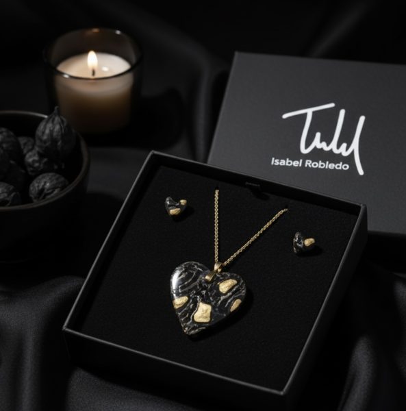 pendientes y colgante en forma de corazón. Porcelana decorada con motivos de oro. Pieza delicada contemporanea que une arte, emoción y simbolismo.